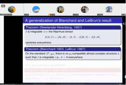 报告中,彦老师首先介绍复流形的基础概念,然后一步地介绍了丘成桐第52问题 ——“维数≥6 的紧致近复流形存在可积的近复结构”,并提及了有同行专家指出抛物流方法在该问题中的可能应用。随后,她探讨了近复结构的局部与整体延拓条件,分析了几何框架下的延拓限制。最后,通过具体的构造,证明了在六维球面上存在可整体延拓的近复结构,但任何延拓均是不可积的,为问题提供了反例依据。参会师生通过此次讲座,对于丘成桐第52问题和近复结构的延拓性等研究专题和前沿动态形成了较为全面的认知,自身知识体系得到进一步充实与完善。
